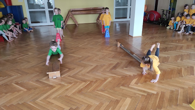 Dziś spotkaliśmy się z grupą IV na sali gimnastycznej, aby wspólnie wykonywać ćwiczenia fizyczne.